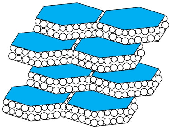 Cartoon representation of a high magnification oblique cross-section through a mollusk shell nacre layer, consisting of “brick and mortar”-arranged hexagonal aragonite tablets that are comprised of spherical mineral nanoparticles. Adapted from references [38,39,40,41,42].