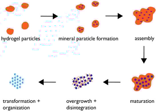 However, why is a hydrogel so significant? A hydrogel possesses three critical properties that would be advantageous to have vis a vis mineral formation and crystal growth [46,47,48,49,50,51]. First, there is volumetric confinement, which has been shown to be important for amorphous phase stabilization [18,20] and crystal growth [20,52,53]. In the case of a hydrogel, the internal pores suffice as “limited volume reaction vessels”, where nucleation would be permissible, but amorphous solid formation would be restricted in dimension by the surrounding gel matrix [20,46,47,48,49,50,51]. Second, the gel matrix would affect ion and water diffusion, such that the movement of each will impact nucleation kinetics and hydration/dehydration processes, respectively [20,46,47,48,49,50,51]. In turn, these events can affect ACC formation, stabilization, and transformation. Third, hydrogels form as a result of assembly of polymer chains [20,46,47,48,49,50,51], and thus there is the potential for hydrogel-associated mineral nanoparticles to be co-assembled as the hydrogel forms. Thus, the presence of a hydrogel matrix within a mineralization environment is impactful, and we speculate that many skeletal elements arise from hydrogel- or sol-gel controlled biomineralization processes.