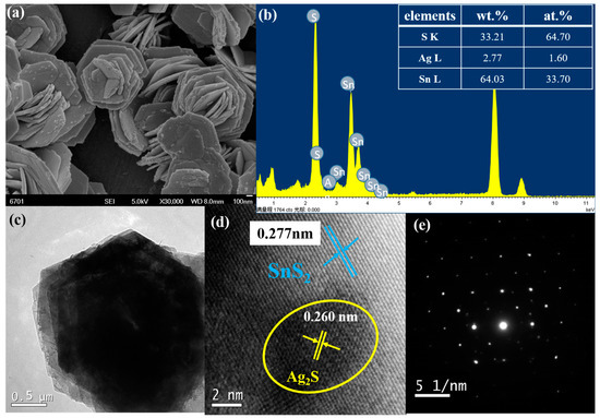 The scanning electron microscope images (a), X-ray energy dispersive spectrum (b), high resolution transmission electron microscope and selected electron diffraction pattern (c–e) of 3% Ag2S@SnS2 composite.