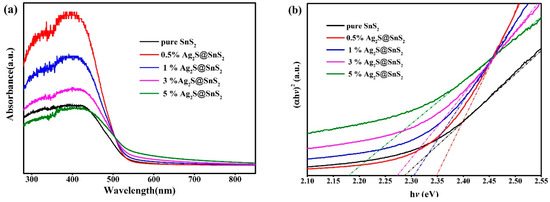 The effect of pure SnS2 and Ag2S@SnS2 composites on the optical characteristics is depicted in Figure 3a. The absorption coefficient (α) of the samples are different, which obeys the Kubelka–Munk function. For direct band gap, the Eg is obtained by extending the linear portion of the [hυ]2 and hυ curves to the intercept at (hυ)2 = 0. It can be seen from Figure 3b that the optical band gaps of pure SnS2, 0.5% Ag2S@SnS2, 1% Ag2S@SnS2, 3% Ag2S@SnS2, and 5% Ag2S@SnS2 samples are 2.278 eV, 2.35 eV, 2.30 eV, 2.27 eV, and 2.18 eV, respectively. With the increase of Ag2S, the optical band gap of Ag2S@SnS2 composite becomes narrower than that of pure SnS2. Notably, the optical band gap of 3% Ag2S@SnS2 is close to that of pure SnS2.