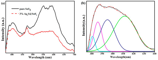 Since the ultraviolet luminescence peak centered at 390 nm is asymmetrical, the PL curve of pure SnS2 sample is fitted for 380 nm, 385 nm, 395 nm, and 411 nm in Figure 5b. Notably, 380 nm, 385 nm, and 395 nm peaks are the three ultraviolet luminescence, which originates from the exciton recombination corresponding to the near-band emission (NBE) of the SnS2 wide band gap caused by the quantum confinement effect. However, the purple light emitting band at 411 nm is due to surface defects, interstitial sulfur vacancies and SnS2 lattice gap defect of shallow deep and deep traps [20]. The well-crystallinity of pure SnS2 and 3% Ag2S@SnS2 nanoflowers is confirmed by the appearance of the near-edge purple peak. Meanwhile, the blue light at the center of 471 nm can be attributed to the self-activation center formed by the tin vacancies in the lattice or the energy transfer between the sulfur vacancies and the sulfur gap [21]. Due to oxygen-related defects (O+N) at low formation energies, defect-related luminescence is mainly yellow light at 589 nm [22]. A weak red luminescence peak at 688 nm might at a result of impurities and primary defects, such as tin atoms of interstitial atoms in SnS2 [23].