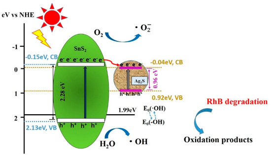 A possible mechanism of photocatalytic degradation is proposed to elucidate the enhanced catalytic activity of the Ag2S/SnS2 heterojunction composites for the dye degradation, as shown in Figure 10. The Eg of SnS2 and Ag2S is 2.28 eV and 0.96 eV, respectively.