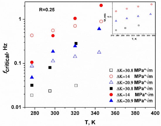 The predicted threshold of loading frequency (fcritical) corresponds to a scenario where the plastic zone is saturated with hydrogen atoms, and it is also expected that less time is required to saturate the plastic zone if the movement of hydrogen atoms () is enhanced. The inset of Figure 2 shows that the predicted velocity of the hydrogen atoms increases with temperature, and the prediction was verified in Figure 4 in the next section. Basically, more hydrogen atoms can aggregate in the plastic zone during the same time interval and under the same stress intensity as T is increased. In other words, the time required to saturate the plastic zone is smaller and the temperature is higher under the same loading condition. In Figure 2, the filled symbols were tested for critical loading frequency in HY-130 steel and the open symbols are the predicted values. The results showed rough agreement and verified the temperature enhancement to critical loading frequency. The predicted values and empirical values did not converge as the stress intensity was large (ΔK = 30.8 MPa * m0.5), because the space between the adjacent iron atoms was enlarged as the stress intensity increased. Thus, hydrogen diffusion was enhanced because of the extra volume induced by a larger stress intensity [35]. This kind of enhancement is negligible in this calculation, however, predictions under common stress intensities (ΔK = 14 or 20.9 MPa * m0.5) showed good agreement with the empirical values.