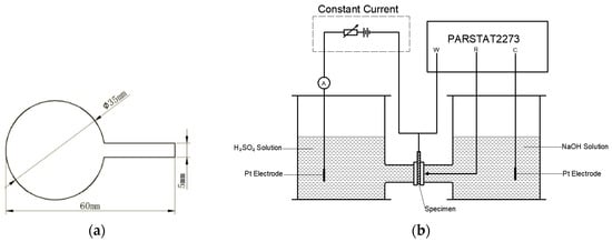 (a) The X80 specimen. (b) The equipment designed for this study, which consisted of a constant current, the PARSTAT2273, and double electrolysis cells.
