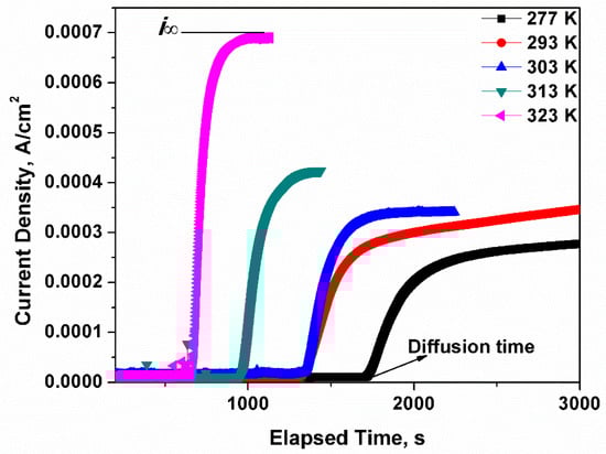 The facilitating effect of temperature on hydrogen movement was confirmed by the results shown in Figure 4. The sharp rise of the current density could be detected and recorded in a shorter time at high temperature. To be specific, the length of the initial horizontal line was negatively proportional to the temperature, which indicates that less time was spent by the first hydrogen atom travelling to the testing side. The positive correlation of hydrogen concentration with temperature was verified using Figure 4. As osmotic current densities of hydrogen atoms were tested at different temperatures, there was a terrace value for each temperature where the current density stayed constant, and this current density corresponded to the bulk hydrogen concentration in the steel. The relationship of current density with bulk hydrogen concentration is