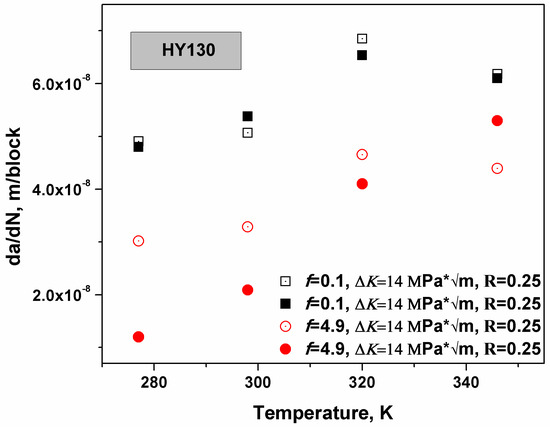 This schematic illustrates the temperature dependence of crack growth in HY130 steel [33]. As f < fcritical, the crack growth rate was maximized at 320 K.