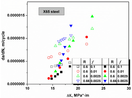 In Figure 6, the crack growth rate in X65 was tested at different R ratios and loading frequencies, and the ΔK value ranged from 10 to 25 MPa * [41]. The yield strength σys of X65 steel was 448 MPa, and was much smaller than that of the HY130 steel. Typically, steel with a smaller yield strength has a larger plastic zone and generates more plastic deformations before failure as the plastic zone size is negatively related to yield strength under the plain strain condition, . The size of the plastic zone is smaller for steel that possesses a higher yield strength. The plastic zone is the area concentrated with defects caused by plastic deformations, which would trap significant amount of hydrogen atoms. The theoretical model was based on HEDE theory; therefore, the trapping effects of plastic deformation-caused defects had been ignored. Hence, for a high strength steel in which the plastic zone is small, the model is more accurate and the fixing parameter n approximates unity. Hence, the n value of X65 steel was smaller than that of HY130. In Figure 6, all predicted crack growth data fit very well with the n value of 0.92.