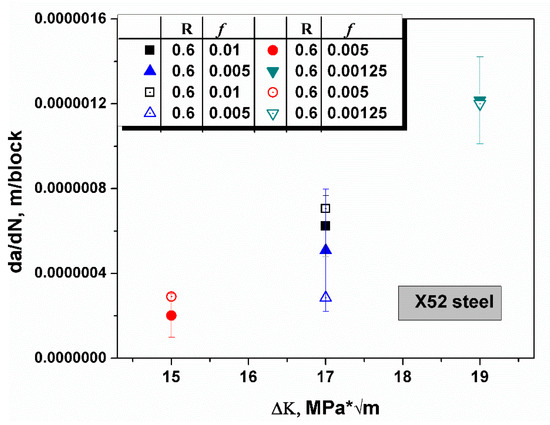 The same rule can be applied to another steel, X52, which possesses a smaller yield strength when compared with X65. In Figure 7, the R ratio was constant, the loading frequency ranged from 0.001 to 0.005, and the stress intensity was distributed from 15 to 19 MPa * [42]. All predictive values were located in the range of error bar of the empirical values and confirmed that all predictions matched well with the experiments with an n value of 0.88. A triangulation rationalized that the brittle crack growth model based on hydrogen embrittlement is applicable in high strength steel. The hypothesis of the model, where a sharp rise of hydrogen concentration causes the formation of a nanoscale hydrogen-rich region in which the hydrogen concentration approached ten thousand times of the bulk equilibrium hydrogen concentration, was verified.