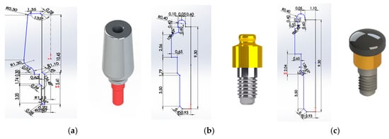 2D Sketch and rendering, (a) universal abutment, (b) locator abutment, (c) equator abutment, measured in mm.