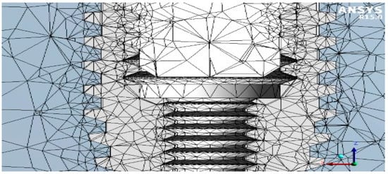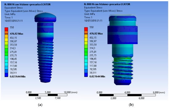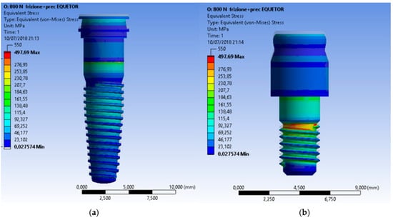 The components of the dental implants were tested using a compression load of 800 N [4,5,6,7,8]. All the loads were distributed on the prosthodontics components surface in contact (screwed) with the dental implant. The bone-implant and the bone—bone contact conditions established in this FEM analysis are reported in Table 4 as follows: