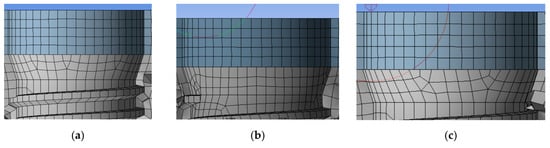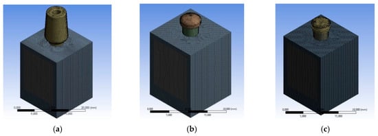 Meshing process, (a) mesh of the universal prosthesis, (b) mesh of the locator prosthesis, (c) mesh of the equator prosthesis.