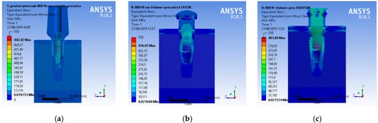 From an initial analysis, it was deduced that the whole system was not prejudiced (Figure 8). As observed, no system reached failure due to static rupture. In general, from the extension of the stressed areas, the following results were registered, that is, the system that stressed the bone less was the universal prosthesis, the system that most stressed the bone was the locator prosthesis, and the system that had the highest peak stress value was the equator prosthesis.