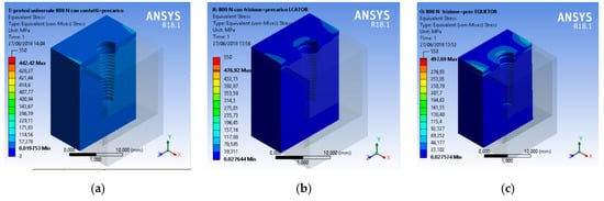 Compared to all the papers currently available in the scientific literature, this paper was the only study presenting a simulation that was as complete as possible, that is, contact between the surfaces of non-penetration with the friction and preloading of the connecting screw. In the past, to achieve a simpler and faster simulation, it was preferable to use a “joint” connection between the parties and not to take preload into account. Nevertheless, this was to the detriment of the truthfulness of the results. Instead, the authors found a good compromise to achieve results that were as close to reality as possible [3,4,5,6,7,8,9,24].