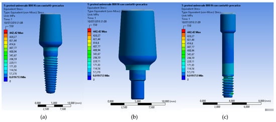 Finally, the last test showed how the most stressed system was the universal abutment. Therefore, the most recommended element is the geometry and shape of the universal abutment. However, there was less stress on the implant compared to the previous case.