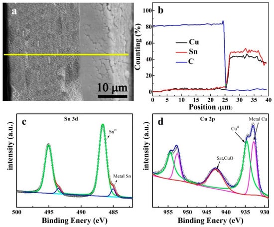 Cross-section image (a) and the linear scan of the EDS result (b) of the Cel-CS electrode. The high-resolution XPS survey of Sn 3d (c) and Cu 2p (d).