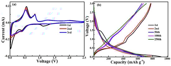 Cyclic voltammograms (CVs) of the Cel-CS electrodes between 0.01 and 2.5 V (vs Li+/Li) at 0.2 mV·s−1 are illustrated in Figure 4a. In the first discharge process, three reduction peaks were observed at 1.0 V, 0.6 V, and 0.1 V, corresponding to the formation of a solid electrolyte interface (SEI) film layer, the transformation of η’-Cu6Sn5 into Li2CuSn-type phase, and the alloying process involved the lithiation of Sn to finally yield Li4.4Sn from Li2CuSn, respectively [26,27,28,29]. In the first anodic scan, the peak located at 0.6 and 0.8 V can be assigned to the reversible de-alloying reaction of Li4.4Sn to Li2CuSn and Cu6Sn5. In the subsequent cycles, the two cathodic peaks change to board slope at 0.5 and 0.1 V, which can be attributed to the structure transformation and recombination [16,26,30,31]. The curves for the second and third cycles were nearly overlapping, and implied good reversibility from the 2nd cycle. Figure 4b shows the 1st, 2nd, 50th, 100th, and 250th galvanostatic discharge/charge (GDC) curves of the Cel-CS electrode at the current densities of 200 mA·g−1 between 0.01 V and 3.0 V (vs. Li+/Li). Consistent with the CV plots, during the first discharge step, a small voltage plateau at about 1.4 V was indicative of the formation of SEI film. The two obvious slope platforms located at 0.6 V and 0.1 V are associated with the alloying process of Cu6Sn5 to Li2CuSn and Li2CuSn to Cu6Sn5, respectively [26,32,33]. After the first cycle, the voltage plateau becomes two sloped regions, which indicates the occurrence of structure recombination. The GDC curves almost coincide with the increasing cycling number, illustrating the superior cycling stability of the Cel-CS electrode.