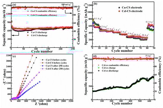 Electrochemical performances of the Cel-CS electrode were measured using CR2032 coin-type half cells. The prepared Sn–Cu alloy electrode was cut into discs (12 mm in diameter) as work electrodes. Li foil was used as the counter and reference electrode, and 1.0 M LiPF6 in ethylene carbonate/dimethyl carbonate (EC/DMC = 1:1 by volume) as the electrolyte. Galvanostatic charge/discharge profiles and rate capability between 0.01 and 3.0 V (vs. Li+/Li) at various current densities were measured on a LAND Cell test system (CT2001A, Wuhan, China). Cyclic voltammograms (CV) and electrochemical impedance spectroscopy (EIS) were carried out on the CHI760E (Shanghai, China). CV tests were performed between 0.01 and 2.5 V (vs. Li+/Li) at a scan rate of 0.2 mV·s−1. The EIS data were tested between frequencies of 0.01 Hz and 100 kHz at a signal amplitude of 5 mV.