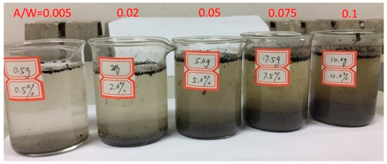 The fresh plant ash used in this study was the remnant after burning rice straw, wheat straw, wood, or corn cob. The plant ash was sieved through 0.3-mm sieve and dried in oven. The dried plant ash was then mixed with deionized water (pH = 6.7 at 20 °C) and stirred for 2 mins. In the mixed suspension liquid, the plant ash released alkaline ions, which could change the pH value of the suspension. In this study, five testing specimens with different ash-to-water (A/W) mass ratios were prepared in 500-mL glass beakers, as shown in Figure 1. After 30 min defecation, the lixiviums as presented below are filtered with filter papers.