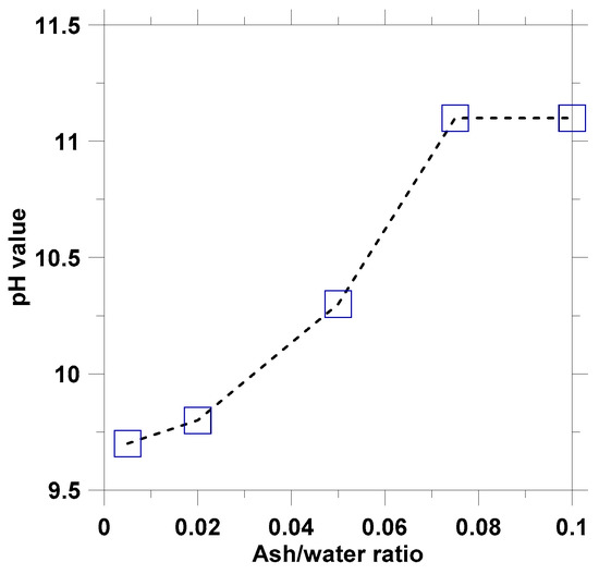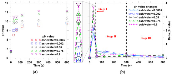 The pH values of suspensions were measured at 0.5, 1, 2, 5, and 10 min after stirring with the beginning of pH = 6.7 (deionized water). Figure 2 presents the changes of suspension’s pH value from stirring. The result indicated that the higher ash/water ratio yielded the higher final pH values as shown in Figure 2a. The changing trends of pH values for different suspensions were found to be similar, which showed rapid increase in the first 150 s and then remained with the relatively constant values. However, the pH value of the suspensions with high ash-water ratio increased at a faster rate than those with low ash-water ratios, and yielded higher final pH values.