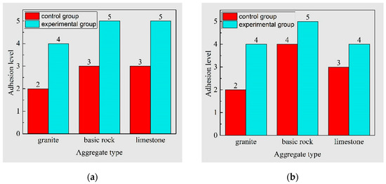 Asphalt-aggregate adhesion level based on stripping test: (a) #90 asphalt and (b) #110 asphalt (samples without treated were marked as control group, while the ones soaked with plant ash lixivium were marked as experimental group).