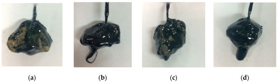 Visual observation of granite aggregates after stripping test: (a) #90 asphalt (control); (b) #90 asphalt (treated); (c) #110 asphalt (control); and (d) #110 asphalt (treated).