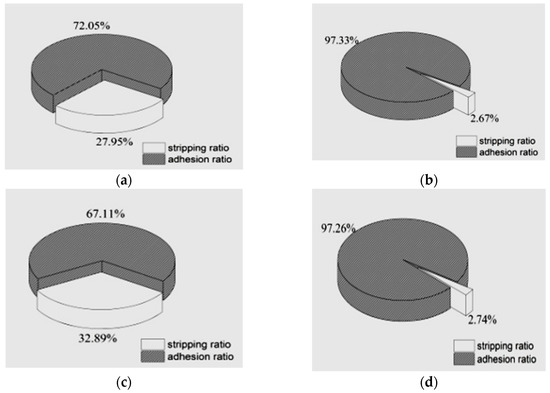 The adhesion and stripping ratios of granite specimen after modified stripping test: (a) control specimen with #90 asphalt; (b) treated specimen with #90 asphalt; (c) control specimen with #100 asphalt; and (d) treated specimen with #110 asphalt.
