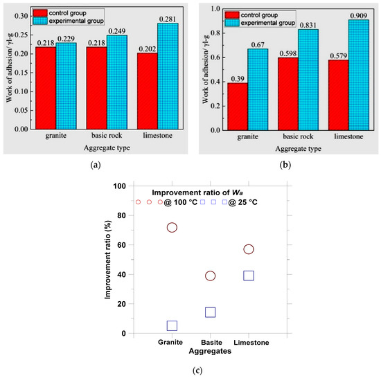 Adhesion work and improvement ratio by plant ash lixivium treatment for aggregates with #90 asphalt: (a) Wa at 25 °C; (b) Wa at 100 °C; and (c) improvement ratio.