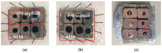 Based on the binary images, the surface areas of asphalt binder (black) and the exposed area of aggregate specimen (white) can be determined. Therefore, the adhesion ratio was calculated using Equations (1) and (2).
