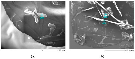 The SEM analysis showed that there were feather-like, needle-like, and square crystals on aggregate surfaces (Figure 14). In these images, the locations of 004, 022, and 023 at different crystals (as shown in Figure 14) were scanned by EDS, and the element composition was presented in Table 6. Although the component compositions of each burning plant ash were different, the main crystallizations of calcination were the same [22]. According to previous literature [21,22,24], the oxide compositions of the main chemical components of plant ash were SiO2, K2O and CaO, while the main crystalline compounds were generally K2CO3, KHCO3, K2SO4, KCl, and SiO2, et al. The SiO2 is an insoluble component and K2SO4 and KCl are neutral salts. However, K2CO3 and KHCO3 can be ionized following Equations (8)–(10), which can explain that the pH value of the suspensions with plant ash lixivium increased over leaching time (Figure 2).