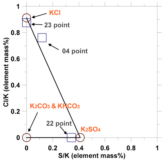 Based on the distribution of K, S, and Cl elements, it was concluded that there was no KCl at 022 point and no K2SO4 at 023 point because S and Cl elements were not detected, respectively. Further, the element ratios of Cl/K and S/K detected by EDS were plotted in Figure 15, indicating the phase of KCl, K2SO4, and K2CO3/KHCO3. It was found that only KCl was present at point 023. The main phase at point 022 was K2SO4, with small content of K2CO3/KHCO3. At point 04, the mixture of KCl, K2SO4, and K2CO3/KHCO3 was found.