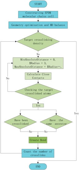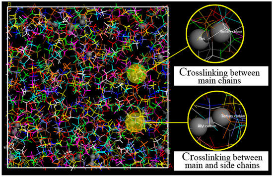- The MD simulation results for the glass transition temperature and stress–strain curve were compared with values in the literature, and there is good agreement. The simulated O2 diffusion coefficient is closer to the experimental value than the Rutherford’s simulation, as the cross-linked EPDM model in the current study is closer to the experimental one.