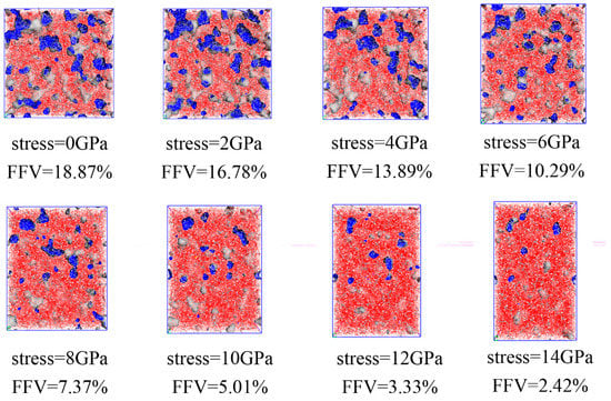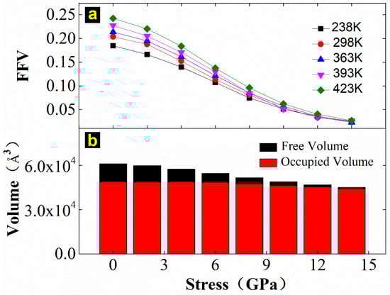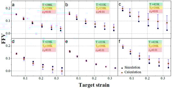 - The free volume predicted by temperature–strain superposition has a significant error compared with the MD simulation results. The error is acceptable only when the reference temperature is 298 K and the target temperature is 333 K, so the superposition of temperature and strain magnitude is feasible only in a particular situation.