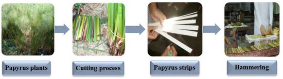 Papyrus stems were cut and collected from Al-Qaramous, Abu-Kbir, Alshrqia, Egypt, in August 2017. Stems were peeled and the green outer rind was removed, then the pith (composed mainly of cellulose and lignin) was cut into strips and hammered (Figure 1) [11].