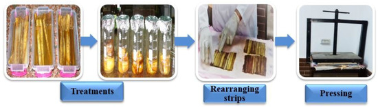 Strips were treated with 24 treatments (Table 1). Each treatment was carried out in triplicate. The treated strips were joined together and rearranged by lamination, then pressed down to form a sheet (Figure 2), as described above. This method was used in a manufacturing process similar to archaeological papyrus. The manufactured papyrus sheets are presented in Figure 3.