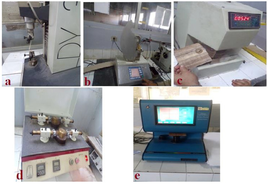 Apparatuses for measuring the mechanical and physical properties of the manufactured papyrus sheets. (a) Tensile testing machine; (b) Tear testing machine; (c) Burst strength tester BS 20T; (d) Double-fold number DBF 6-60; (e) Spectrophotometer Color.