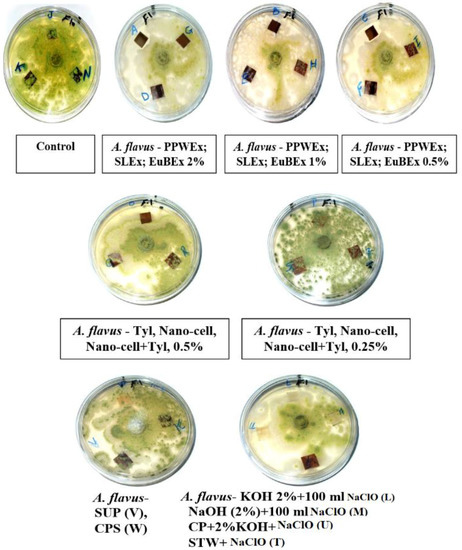 - Salem, M.Z.M.; Zidan, Y.E.; Mansour, M.M.A.; El Hadidi, N.M.N.; Abo Elgat, W.A.A. Evaluation of usage three natural extracts applied to three commercial wood species against five common molds. Int. Biodeterior. Biodegr. 2016, 110, 206–226. [Google Scholar] [CrossRef]