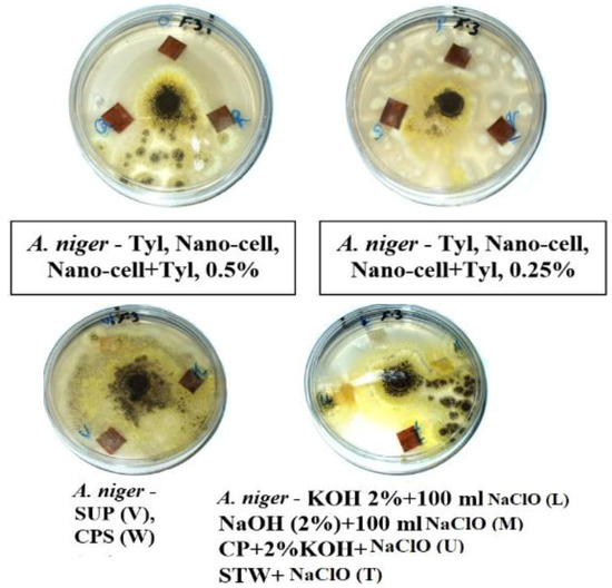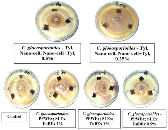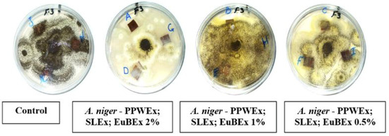 Figure 5, Figure 6 and Figure 7 present the antifungal activity of manufactured sheets against three moulds (Aspergillus flavus, A. niger and Colletotrichum gloeosporioides). The inhibition zones (mm) as well as the growth on the discs are presented in Table 3. Compared to the control treatments, after 14 days from the incubation, nearly no growth of A. flavus was found in the Papyrus discs manufactured with PPWEx 2%, PPWEx 1%, PPWEx 0.5%, EuBEx 2%, KOH 2% + 100 mL NaClO and CP + 2%KOH + NaClO. Completely no growth of C. gloeosporioides was observed on the papyrus disc manufactured from strips pre-treated with PPWEx 2%, SLEx 2% and EuBEx 1% after 14 days from the incubation, compared to control treatments (Table 3). According to the visual observation, no growth of A. niger was found on the papyrus disc taken from the sheets treated with PPWEx 2%, Tyl 0.5% and Nano-cell + Tyl 0.5% (1:1 v/v). The inhibition zones (mm) as well as the growth on the discs are presented in Table 3.