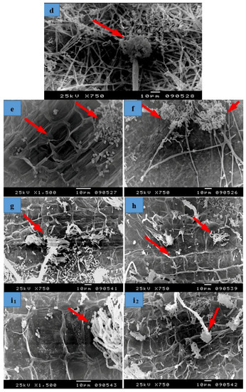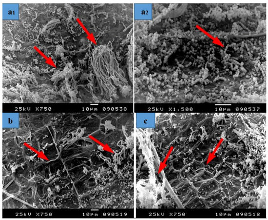 SEM images of inoculated Papyrus sheets showed a huge growth of fungal mycelial of A. flavus (Figure 8) on strips treated with 10% DMSO (Figure 8a1,a2). A decrease in the fungal colonization as well as the appearance of cell walls were observed in the Papyrus strips pretreated with S. babylonica leaf extract (2%) (Figure 8b). Some growths of fungal mycelial as well as the appearance of Papyrus cell walls are shown in the strips pretreated with E. camaldulensis bark extract (2%) (Figure 8c). An intensive colonization growth of A. flavus is observed in the strips soaked in tap water after hammering (Figure 8d). A decrease in fungal hyphae growth and the appearance of erosion in the structure of papyrus cell walls is shown in strips pretreated with KOH (2%), then 100 mL NaClO (Figure 8e). Deterioration patterns are clearly shown in the cell structure of the strips pretreated with NaOH (2%), then 100 mL NaClO, with a decrease in fungal growth (Figure 8f). Some growths of fungal mycelial were shown in strips pretreated with nano-cellulose + tylose (1:1 v/v, 0.25%) (Figure 8g). A decrease in mycelial fungal growth was observed in strips pretreated with nano-cellulose and tylose (1:1 v/v, 0. 5%) (Figure 8h) and a decrease in the growth of fungal mycelial as well as cell wall consolidation was found in strips pretreated with nano-cellulose (0.5%) (Figure 8i1,i2).