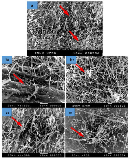 SEM images of papyrus sheets manufactured with some treatments and inoculated with Aspergillus niger. (a1,a2) Papyrus sheet manufactured with strips treated with 10% DMSO; (b) Papyrus sheets manufactured with strips treated with S. babylonica leaf extract (2%); (c) Papyrus sheets manufactured from strips treated with E. camaldulensis bark extract (2%); (d) Papyrus sheets manufactured with strips soaked in tap water after hammering; (e) Papyrus sheets manufactured with strips treated with KOH (2%), then 100 mL NaClO; (f) Papyrus sheets manufactured with strips treated with NaOH (2%), then 100 mL NaClO; (g) Papyrus sheets manufactured with strips treated with nano-cellulose and tylose (1:1 v/v, 0.25%); (h) Papyrus sheets manufactured with strips treated with nano-cellulose and tylose (1:1 v/v, 0. 5%). Arrows refer to dense growth of the fungus.