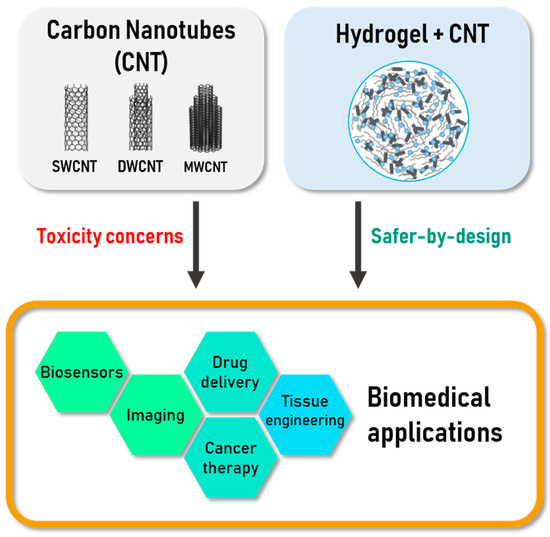 Scheme of the topics addressed in this review: Carbon nanotubes (CNTs) are good materials for various biomedical applications but they raise several question about toxicity. Their utilization as component in nanocomposites like CNTs-based hydrogels could limit those concerns.