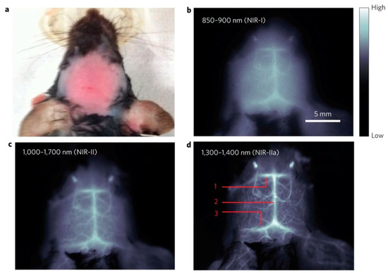 In vivo mouse brain imaging with SWNT–IRDye800 in different Near InfraRed (NIR) sub regions. (a) A C57Bl/6 mouse head with hair removed. (b–d), Fluorescence images of the same mouse head in the NIR-I, NIR-II and NIR-IIa regions. In (d), the inferior cerebral vein, superior sagittal sinus and transverse sinus are labelled 1, 2 and 3, respectively. Reprinted with permission [26].