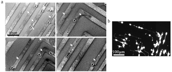Neuro2a cells culture on a SiO2/CNT micropatterned surface. (a) SEM images of neuro2a cells cultured on patterned surfaces after 2 days of differentiation. Arrows point to neurites developed on CNT patterns. The letter A indicates a specific cell body on a CNT feature and the letter B points out a specific cell body outside of a CNT feature (on a SiO2 feature). (b) Optical fluorescence image of neural cells grown on CNT patterns after phalloidin staining. Note that neurites follow the CNT lines turning at an angle of 90°. Reprinted with permission [37].