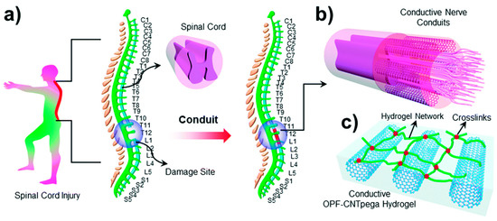 (a) Schematic demonstration of the spinal cord in the human body. (b) Conductive nerve conduits for spinal cord injury treatment. (c) Structure of the conductive OPF-CNTpega hydrogel. Reproduced from [88] with permission from the Centre National de la Recherche Scientifique (CNRS) and The Royal Society of Chemistry.