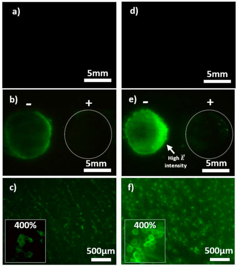Visualization of skin electroporation. Representative pictures of mouse skin after electropermeabilisation with CTRL-AGsummuri and DWCNT-AG (1 wt. % DWCNT) containing 4 kDa FITC-dextran at 1 mm. Images (a,d) show CTRL-AG and DWCNT-AG without electrical stimulation under identical conditions at the same intensity level (×0.57). Images in (b,e) are with electrical stimulation: The anode is on the left-hand side and the cathode on the right-hand side (magnification ×0.57). (c,f) Magnifications (×4) of the anode area of (b,e), respectively. The frame on the left side of (c,f) pictures shows a numerical magnification ×400. Reprinted with permission [104].