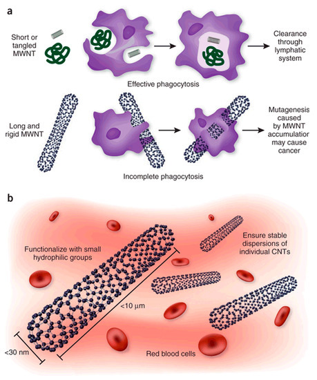 (a) The effect of CNT structure on phagocytosis by macrophages and clearing from tissues. Whereas macrophages can engulf MWNTs with a low aspect ratio (ratio of length to width) before their clearance by draining lymph vessels, MWNTs with a high aspect ratio cannot be cleared and accumulate in tissues, where they promote carcinogenesis. (b) In addition to their dimensions, other considerations relevant to the safety of CNT include increasing their solubility and preventing their aggregation, to facilitate urinary excretion and thereby prevent tissue accumulation. Reprinted with permission [123].