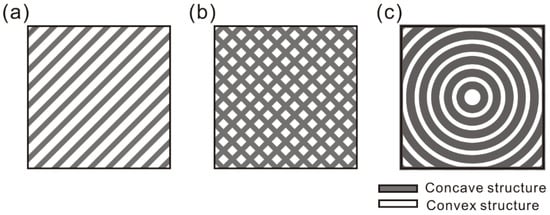 Figure 1. Schematic of the expected morphology of the micro-scale structure surfaces: (a) linear groove, (b) gridding groove, (c) arc groove.