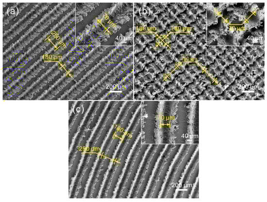 Figure 3. SEM images of the morphology of the micro-scale structure surfaces (texture spacing of 250 μm): (a) linear grooves, (b) gridding groove, (c) arc grooves (the insets correspond to their high-magnification SEM images).