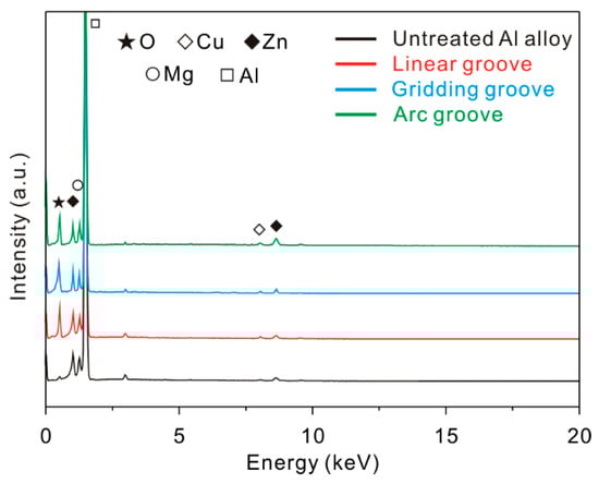 The EDS energy spectrum of the micro-scale structure surfaces with a texture spacing of 150 μm is shown in Figure 4. It was found that the elements of the treated surfaces were the same as in the untreated surface. O, Cu, Zn, Mg, and Al were detected. From the element content of the surfaces exhibited in Table 3, it was found that the oxygen content of the surface underwent a significant increase after laser micro-engraving treatment, which was consistent with previous research. During laser micro-engraving treatment, pure aluminum is transformed into oxidized aluminum. However, the content of each element of the as-prepared surfaces with different morphologies were almost maintained at the same level, indicating that the material properties of the micro-scale structures were the same.