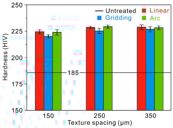 As is well known, the hardness can greatly affect the tribological properties of Al alloy. During laser micro-engraving treatment, because of the high temperature gradient, the hardness of the surfaces will be affected. Thus, the Vicker’s hardness of the as-prepared surfaces was measured. As shown in Figure 5, the hardness of the untreated surface was used for reference (185 HV). It can be seen that the hardness of the fabricated surfaces improved significantly. It is possible that the high temperature gradient of the material of the surface layer induced quenching strengthening during the laser micro-engraving treatment. There were no considerable differences in the hardness among different micro-scale structure surfaces. Though the hardness of the micro-scale structure surfaces underwent a slight increase with the increase of texture spacing, they were still within the same level.