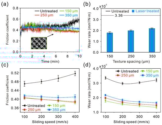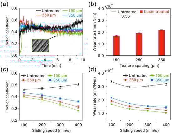 In order to investigate the tribological properties of the micro-scale structure surfaces, tribological tests were carried out. Generally, 7075 Al alloy will frequently suffer from slight abrasions during use. Thus, a comparatively low applied load (0.3 N) and low sliding speed (100–400 mm/s) were selected. The curve of the dynamic friction coefficient of the linear groove surface samples (LGS) against a steel ball friction pair at a constant sliding speed of 100 mm/s and load of 0.3 N is shown in Figure 6a. The curve of the dynamic friction coefficient of the untreated surface is shown for reference. Initially, the friction coefficient of LGS with different texture spacing showed a fluctuation. This was because the irregular tiny structures on the convex structure surface of the LGS were in contact with the friction pair and became worn first. As the irregular tiny structures were worn out, the friction coefficient entered into a stable stage. Though the friction coefficient of the LGS showed a slight increase with the increment of texture spacing, the friction coefficient was lower than that of the untreated surface (0.46). Furthermore, when the test time rose to 5 min, due to the generation of black wear debris on the surface, the friction coefficient of the untreated surface increased dramatically. Figure 6b presents the wear rate of the LGS after tribological testing (test time of 10 min). It was found that the variation of the wear rate was similar to the friction coefficient. The wear rates of the LGS with different texture spacing were 1.68 ± 0.040 × 10−3, 1.92 ± 0.074 × 10−3, and 2.17 ± 0.023 × 10−3 mm3/N∙m, respectively, indicating that the wear rate of the LGS was much lower than that of the untreated surface. According to the above results, it can be concluded that the formed linear groove highly improves the tribological properties of Al alloy. To further investigate the tribological properties of the LGS, variations of the friction coefficient and wear rate of the LGS with sliding speed are shown in Figure 6c,d. It was observed that the friction coefficient and wear rate of the samples were lower than that of the untreated surface under different sliding speeds, which further indicated the improvement effect of the linear groove on the tribological properties of Al alloy. Furthermore, the friction coefficient, as well as the wear rate, was reduced by increasing sliding speed. By contrast, the difference of the friction coefficient or wear rate between each LGS with different texture spacings gradually expanded as the sliding speed increased. The results indicate that the effect of the linear groove on the tribological properties of Al alloy could be enhanced by increasing sliding speed. However, with the increase of texture spacing, the improvement effect would be weakened.